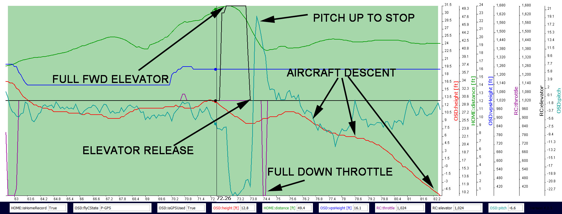 First, it appears that you were flying in reverse stick mode. This is very rare to see and is sometimes difficult to correlate. Normally, 99% of the time, the Right Stick is Elevator and Aileron, with the Left stick being Throttle and Rudder. Yours are completely reversed, but that is an option so no fault of yours for that. Secondly, You were extremely close to the water. Too close for comfort in my opinion. You were traveling at a very high rate of speed at close proximity to the water, when you released elevator and the aircraft performed a very hard brake, pitching up then recovering for a brief few seconds. At the very last data point the aircraft was loosing altitude at which point the data ends. I have seen at least 2 Mini’s loose data transmission after such hard braking. Not saying that is the cause but it is possible. According to the GE profile it looks as though you did hit the water, but I will say the data does not exactly show that. But IMO, that looks to be what happened in this instance.